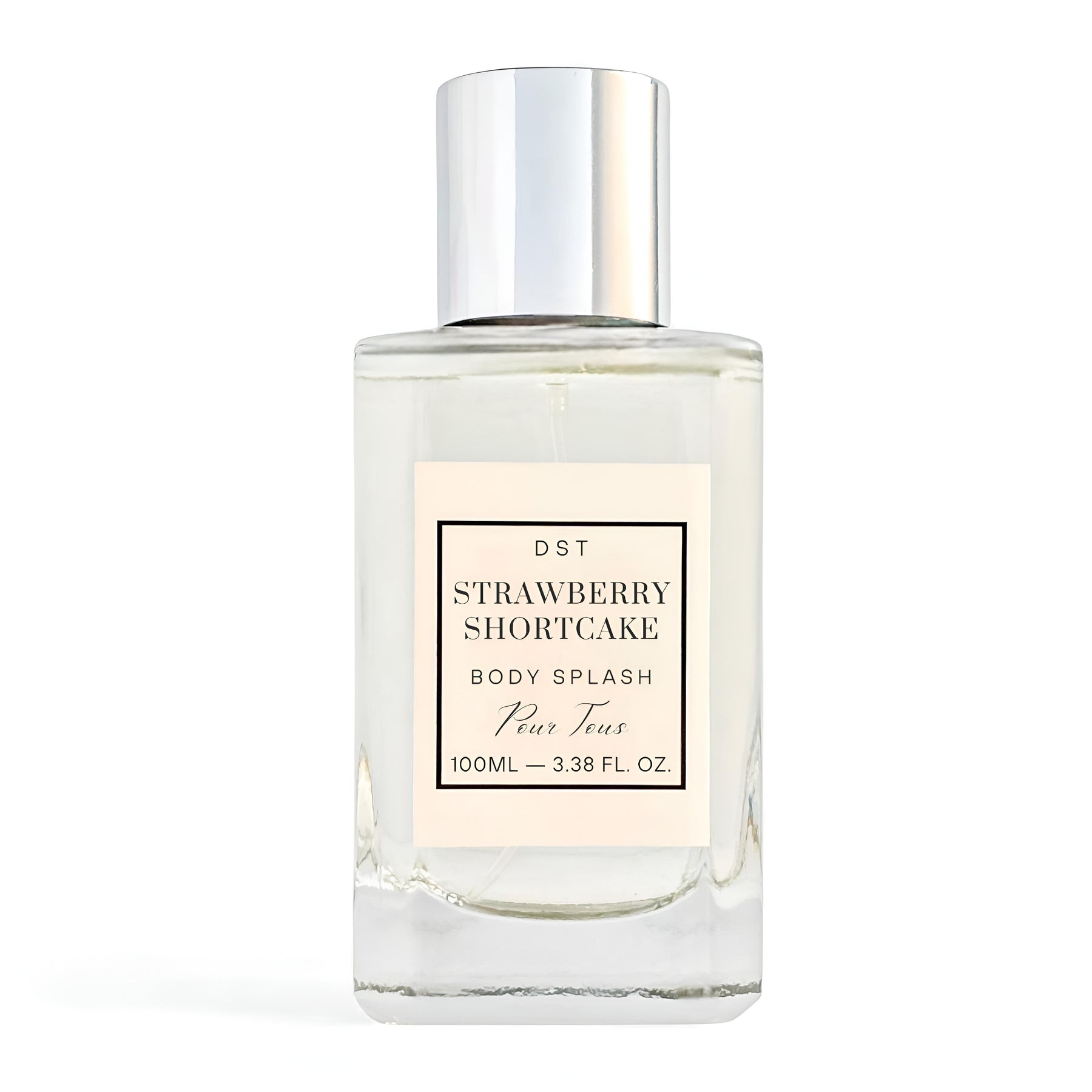 Body splash bottle labeled 'Strawberry Shortcake' by DST on a white background