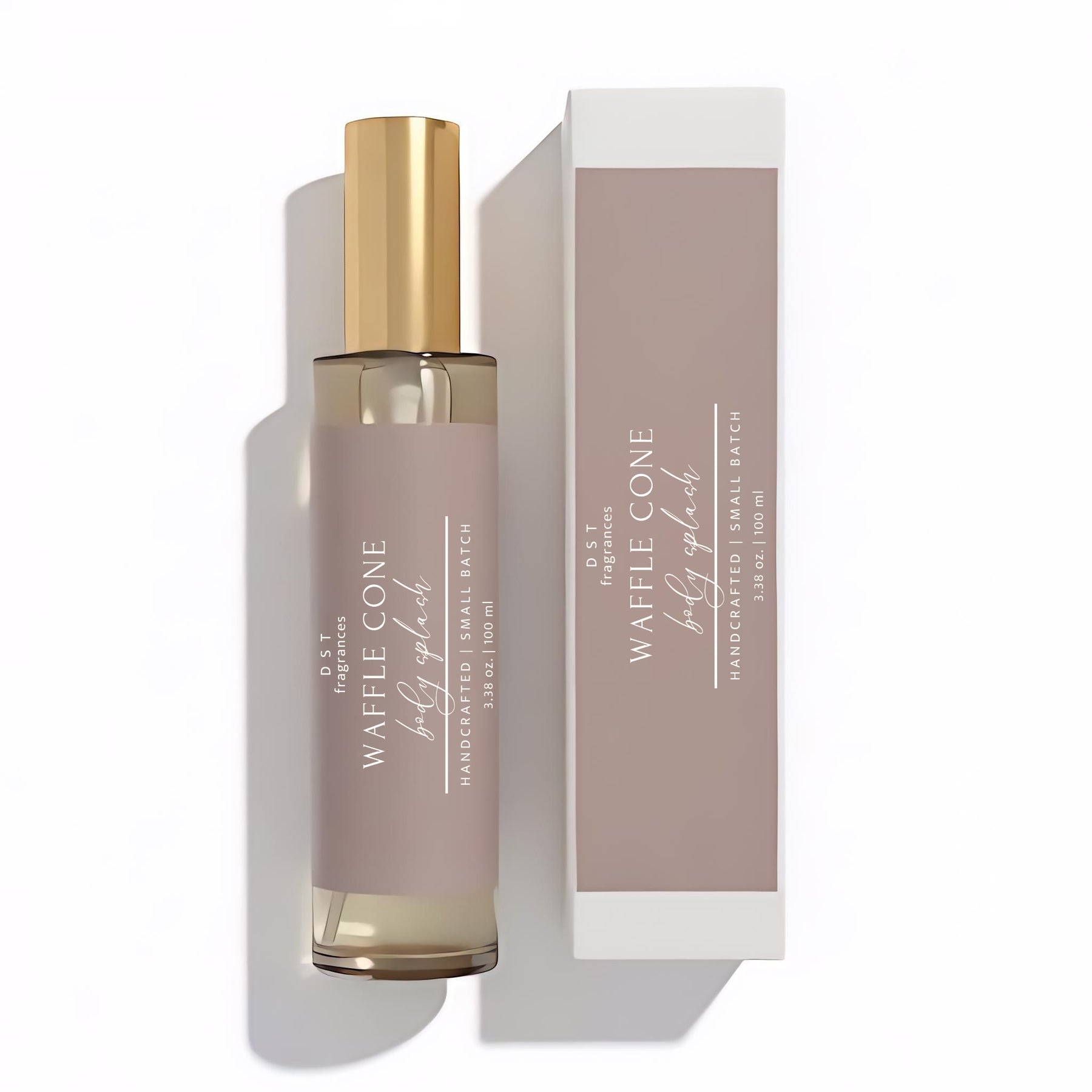 Waffle Cone body splash bottle with gold cap and brown label on a white background